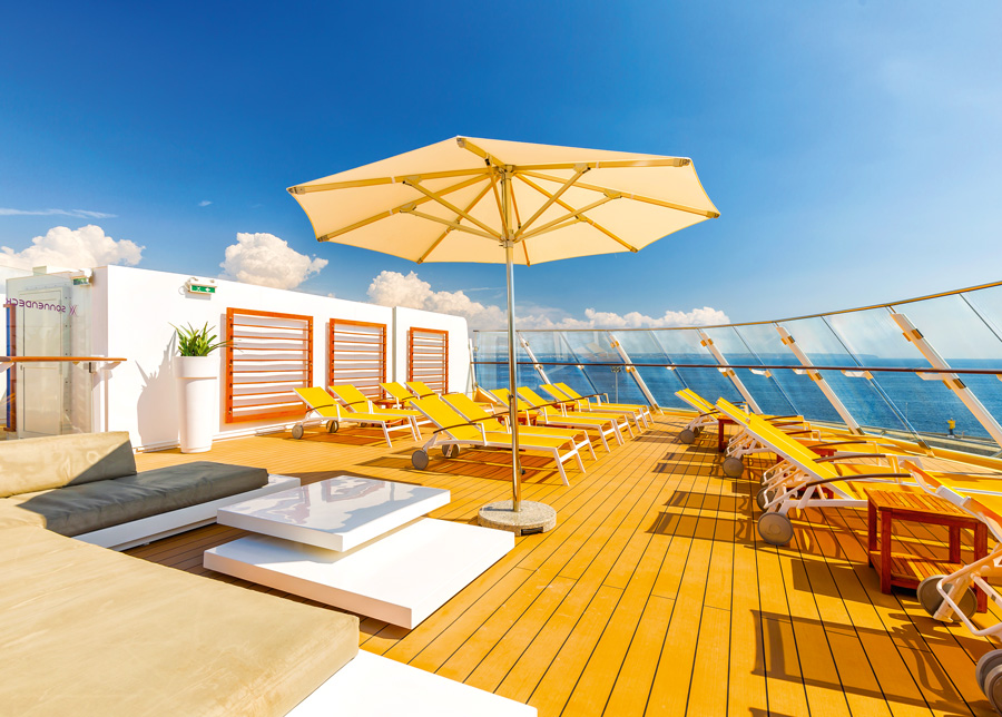 In allen Suiten steht neben mehr Platz zusätzlich eine täglich kostenfrei aufgefüllte Minibar zur Verfügung. Außerdem genießt man Zugang zum privaten X-Lounge-Bereich mit eigener Bar und separatem Sonnendeck – der perfekte Rückzugsort für ruhige Stunden an Bord.